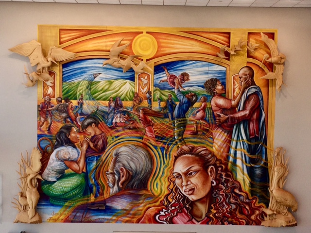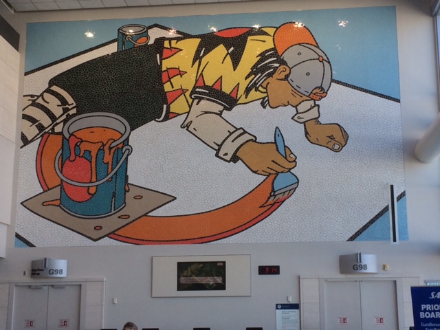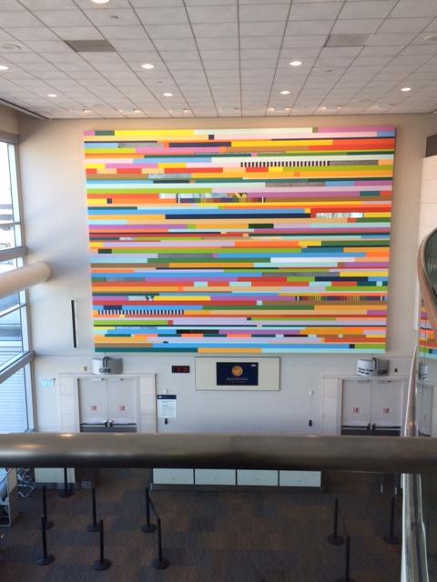 I’ve always liked the sparkling silver disks at the BART exit to the International terminal, like the back of an Alhambra truck but better. The big waiting areas also have big works, like this colorful number: