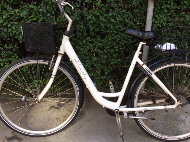 As I said, lots of people ride bikes, many with boxes in the front for cargo, kids, or even another adult. Most of the bikes are black, but I liked this white one