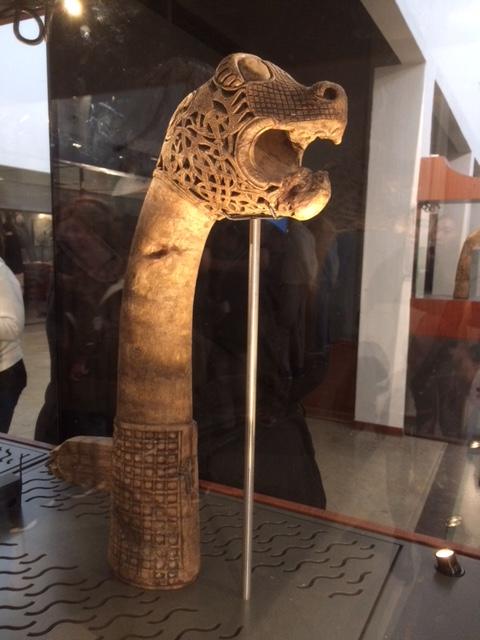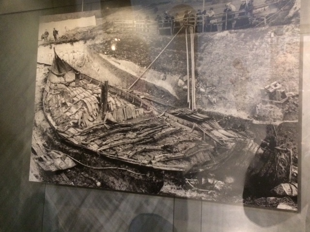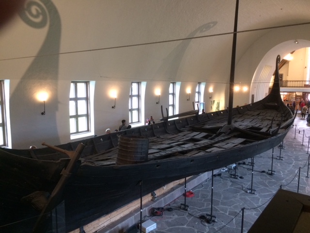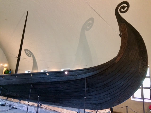 The ships on display are all from the Vikings’ heyday, about 750-1050 CE. All were discovered within the last 150 years, and all were painstakingly restored (of course only partially) relatively recently. All were in effect buried intentionally, but the similarity stops there. The ships now in Rosskilde were loaded up with rocks and sunk in a narrow inlet, as a barrier to prevent invaders’ ships from approaching the town. They sank into mud, which helped to preserve them. The ships now in Oslo were dragged onto land and buried in huge mounds, as tombs for important people; the wet clay also aided their preservation. And the Oslo ships were loaded with both treasures and objects of everyday life, presumably to help their (deceased) occupants thrive in the afterlife.