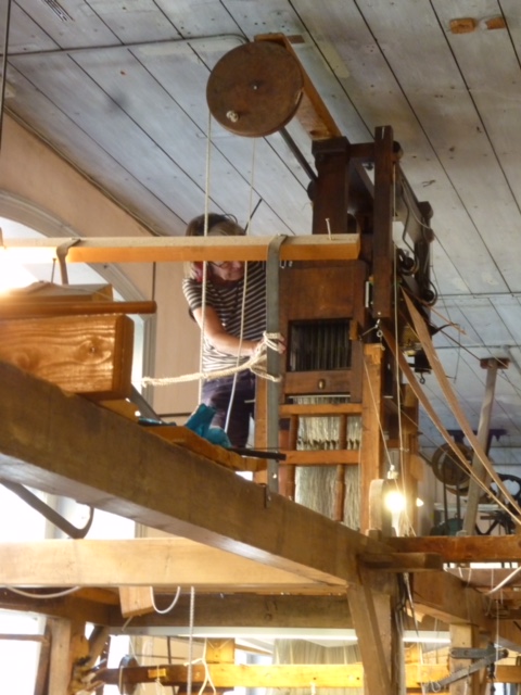 One really fun thing was an incident of industrial espionage. The main guy at the mill went to France, learned about the use of punched cards (the Jacquard loom process), stole a few pieces of equipment, and brought them back. So our artist/weaver lady may have been fixing the mechanism that reads the punched cards, by which the intricacies of the pattern are produced on the loom. (The cards are chained together and feed in from the right side of the photo.)