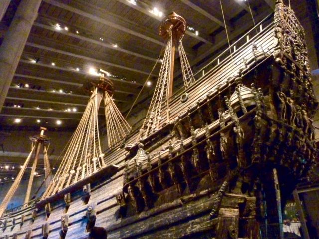 Oh, wait. The Vasa sank about 40 minutes into her maiden voyage, when a gust of wind caught the sails and she keeled over. She remained sunk in the mud until 1961, when recovery efforts finally succeeded. The museum opened in 1990, with over 90% original material. The ship is HUGE, which is pretty much why it sank: way too little ballast below the waterline, competing with massive sails and all those cannons, making it way too top-heavy. (The commission inquiring into the failure assigned no blame, but our guidebook says the king kept pressing the designer for a taller, narrower ship. Another lack of leadership?)