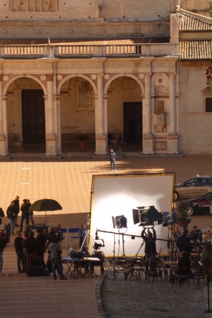 There’s lots more to tell, but I’ll end this post with a modern touch. We had hoped to go into the Duomo in Spoleto, but found the steep approach blocked by police officers volunteering on their off-time. The plaza in front of the church was the filming location for a popular TV series that I’ll have to find. It features a priest named Don Matteo who also solves crimes. (I think he’s hunkier than Father Brown.) anyway, this is all we could see: