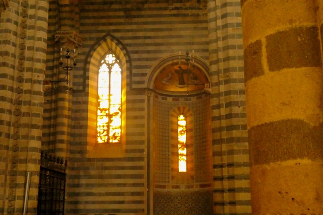 Inside, the church is less glorious, with only fragments of the original frescoes still on the walls. But the windows are beautiful, and I especially liked the combination of stained glass and alabaster. This photo doesn’t do justice to either, but I hope you get the idea: