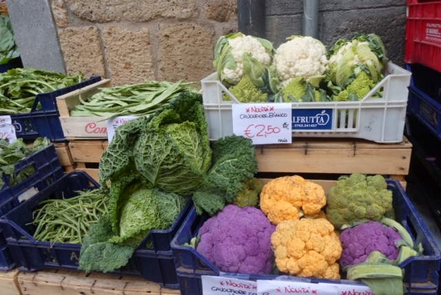 Finally, some bright colors. I keep thinking that I’ll stop taking photos of fresh foods in markets, but I could not pass up these cauliflowers: