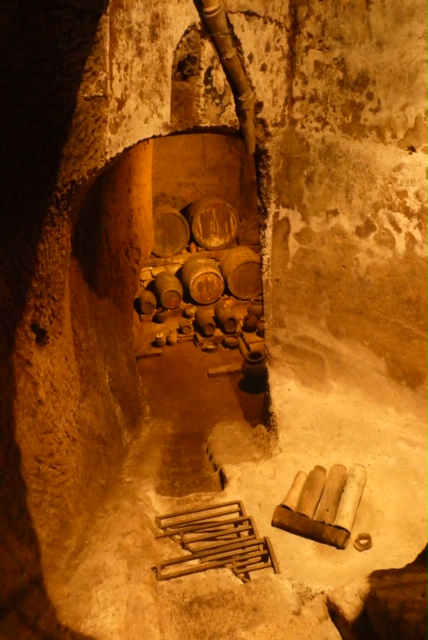 It was originally an Etruscan cistern, in which eels were used to stir up the water to keep it clean and to eat the insects that might be present. (I don’t know the answer to the obvious question.) Because it was dark down there, the eels became blind and white. Huh. Much later, the chamber was used to store wine barrels, and the staircase below the metal ladder has wide sidewalls to make it easier to roll the barrels up and down.