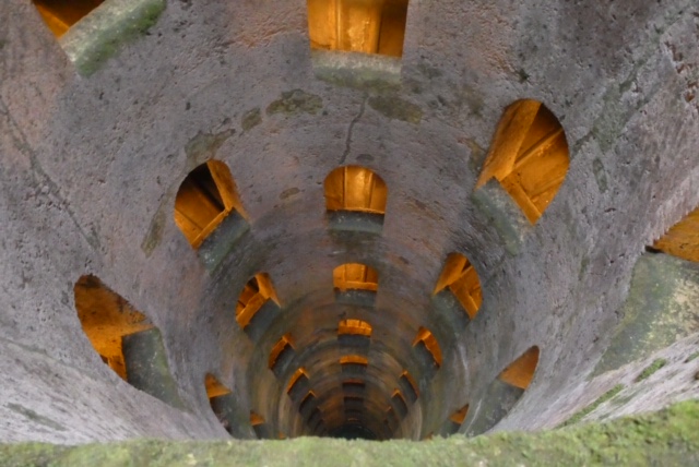 The other Etruscan well that we saw is a very deep cylindrical pit, with two staircases — one for going down, and one for coming up — supposedly to keep the mules bringing the water from running into each other and balking. As we were told more than once, there are 248 steps in each direction, but I’m sorry I don’t know the depth in feet or meters. There are windows in the walls to let outside light into the staircases, and with modern illumination it’s actually kind of pretty: