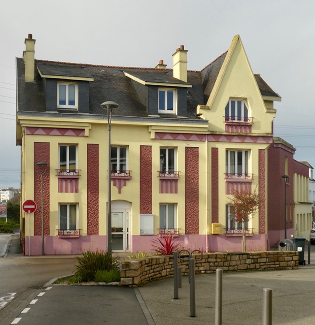 Lorient is a major port, and it was significantly damaged by bombs, so had to be largely rebuilt. Most of the buildings are ho-hum concrete and stucco, but some stand out, like this one in our Lanester neighborhood: