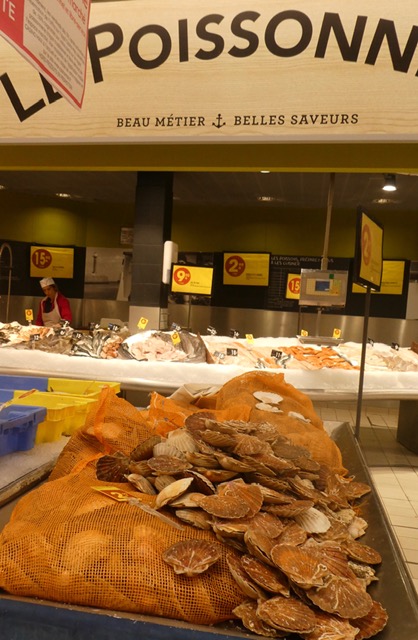 After our friends left the house to us, we made our first trip to the local supermarket, located in the aptly-named Giant Gallery shopping mall. We were relieved that Google Maps worked better for us than it had in Perugia, as we managed the numerous roundabouts and mostly unsigned streets. Supermarkets may have been invented in the U.S., but Safeway and Whole Foods don’t hold a candle to the vast Géant Casino where we shopped. My favorite feature was the fresh fish, and especially this display of scallop shells. (Zoom if necessary.)