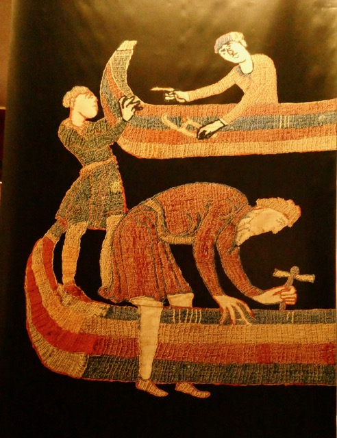 The museum at Bayeux presents the tapestry very well: an audioguide takes you along the >200-foot length of the 3-foot high wool-embroidered linen band at a comfortably quick pace, then you have all the time you want in an exhibition room with lots of detail and context. Photos are allowed in that room, where a few scenes from the tapestry are enlarged and printed on black, like this one, showing the carpenters building one of William’s large Viking-style boats: