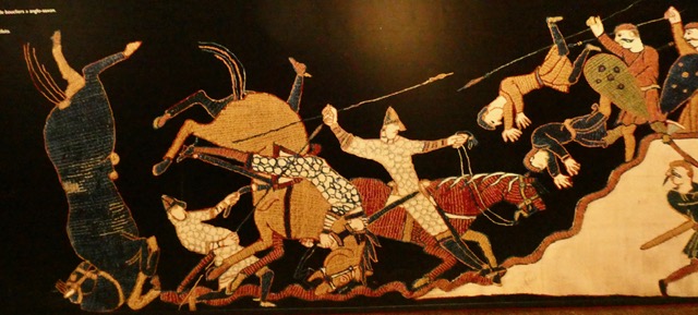The tapestry tells the story leading up to the Battle of Hastings in 1066 when William the Conqueror came across the Channel from Normandy, defeated the English, and became King of England. That’s a pretty important event in European history, if you think about it. One wonders what would have happened if Edward the Confessor had had a male heir . . .