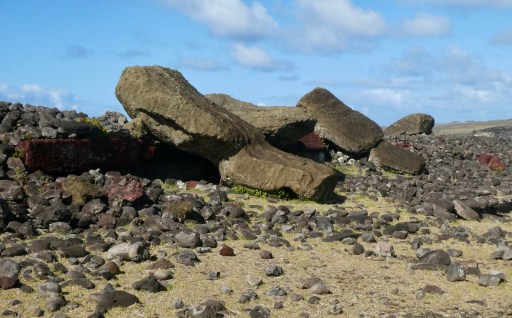 Another mystery: At some point, all the moai were intentionally knocked over, maybe because of social collapse among the Rapa Nui clans. Here’s one that broke in the middle; some of the famous 15 broke at the more obviously fragile neck. Nobody really knows why the moai were destroyed in this way.