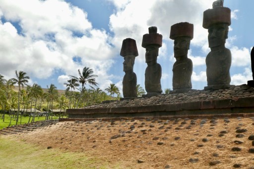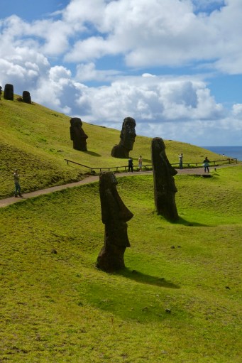 An earthquake in 1960, centered off the coast of Chile, created a tsunami that lifted the famous moai 90 meters inland from where they lay. They were replaced (and some of their heads recemented on their necks) between 1992 and 1996, thanks to support from a Japanese company.