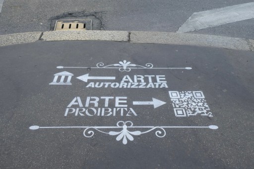 From a sidewalk in Milan, pointers to AUTHORIZED and PROHIBITED art: