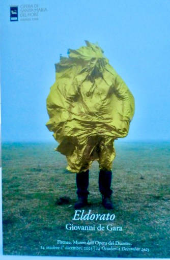 We were surprised and enchanted by a temporary exhibit in the Florence Duomo museum. It was a video with music but no narration, showing the artist in various locations, most of them windy, wrapping himself in a metallic space blanket. This is the ad poster for the video: