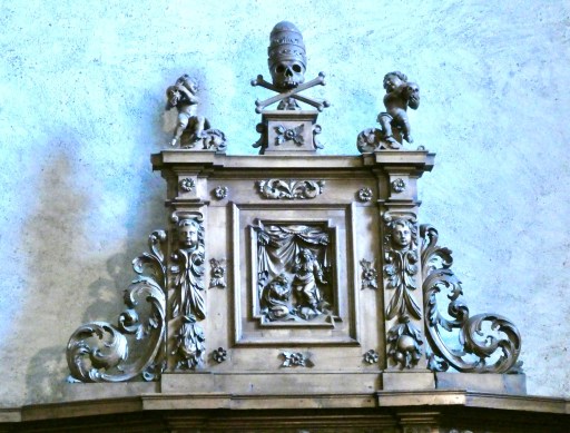 On Sunday, we walked again, up to the town square to see the small church of San Giorgio, built in the 13th century. Our guide book says that many destination weddings are performed here, which is nice. But in such old churches we always seek out reminders of mortality, as in this elaborate carving above the confessional. You may need to zoom the cherubs at the top to see the objects of their adoration.