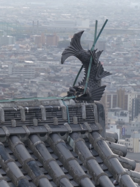 We were able to climb to the top of the castle keep, and got some good views of the castle buildings below and the surrounding countryside. This roof decoration has something to do (I think) with protection from fire (because it’s a fish, hence water):