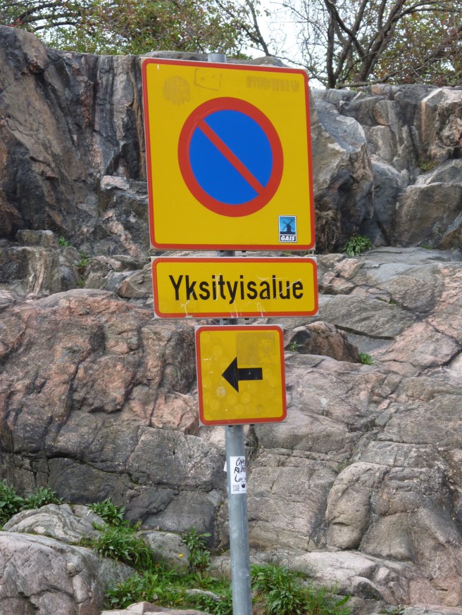 where we started our latest change of venue. We still had some Danish and Norwegian cash (different currencies) which we turned into Euros, which are more familiar to us and made us feel good. However, after our limited knowledge of German had helped us guess some useful Danish, Norwegian, and Swedish words, we are close to illiterate in Finnish. Try this street sign
