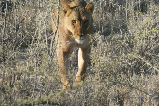 We left Okaukuejo at 7:30 to see more game, and drove ~east, on mostly corrugated roads. Patience, and having a sharp-eyed guide, pay off: we saw a female lion with three cubs, near the road but hidden by bushes. She and the cubs moved around for a while, then she came out and walked right across the road into the flat scrub. Time to go shopping hunting for the family.